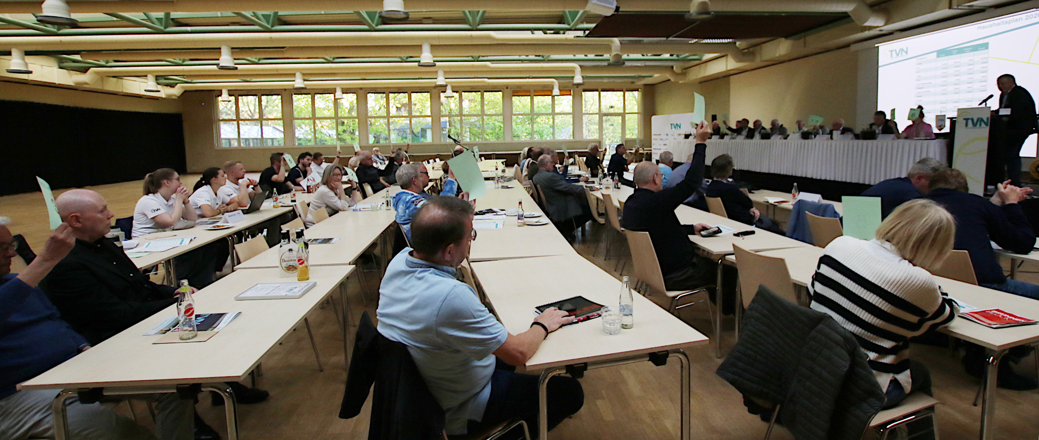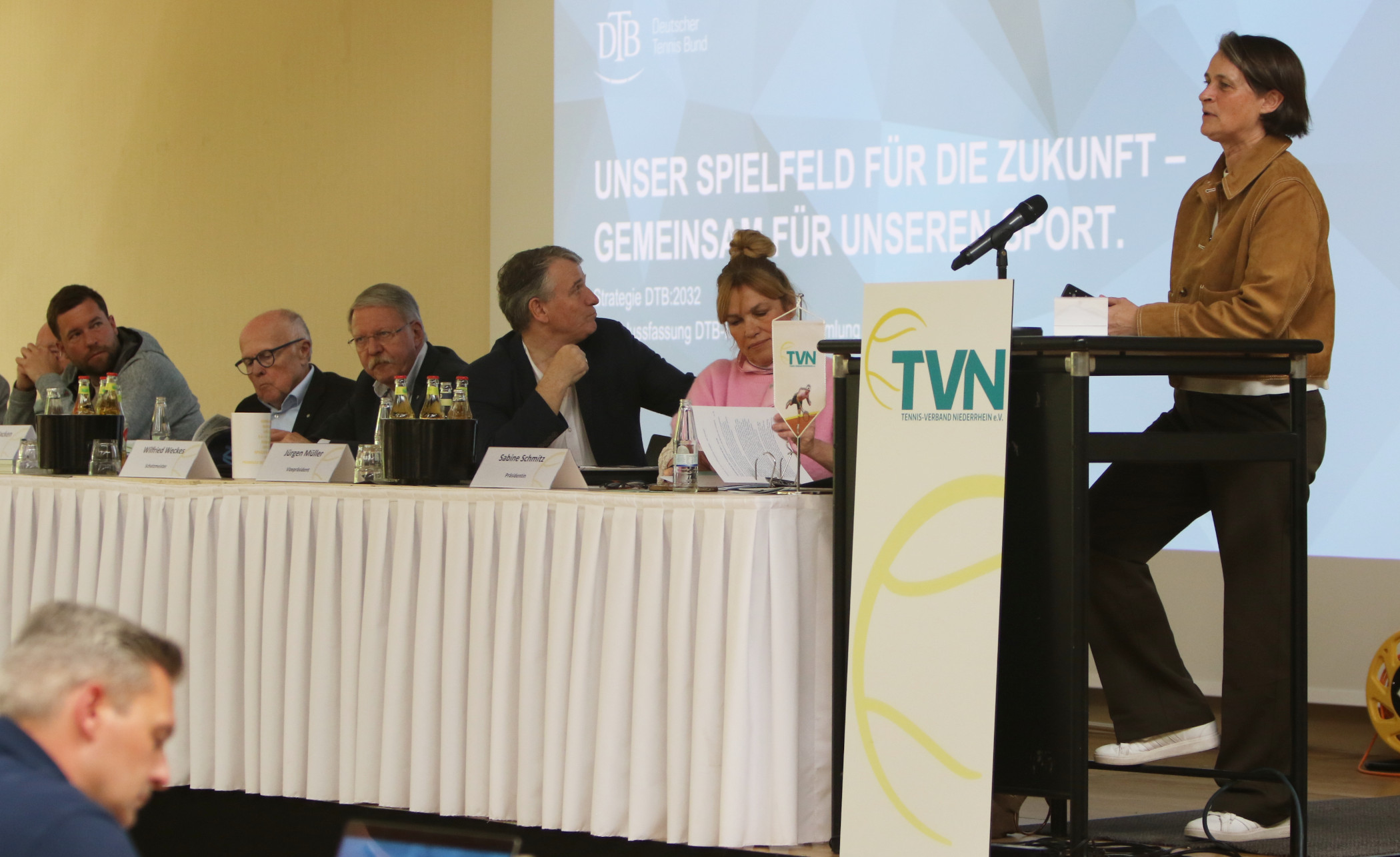 Des Weiteren stellt sich die Anreise der Vorsitzenden als größte Herausforderung dar. Rings um Duisburg sind nahezu alle Autobahnen durch Baustellen und Unfälle verstopft, sodass TVN-Präsidentin Sabine Schmitz die Versammlung, die zum ersten Mal in der Sportschule Wedau stattfindet, mit viertelstündiger Verspätung und in Anwesenheit des DTB-Präsidenten Dietloff von Arnim eröffnet.